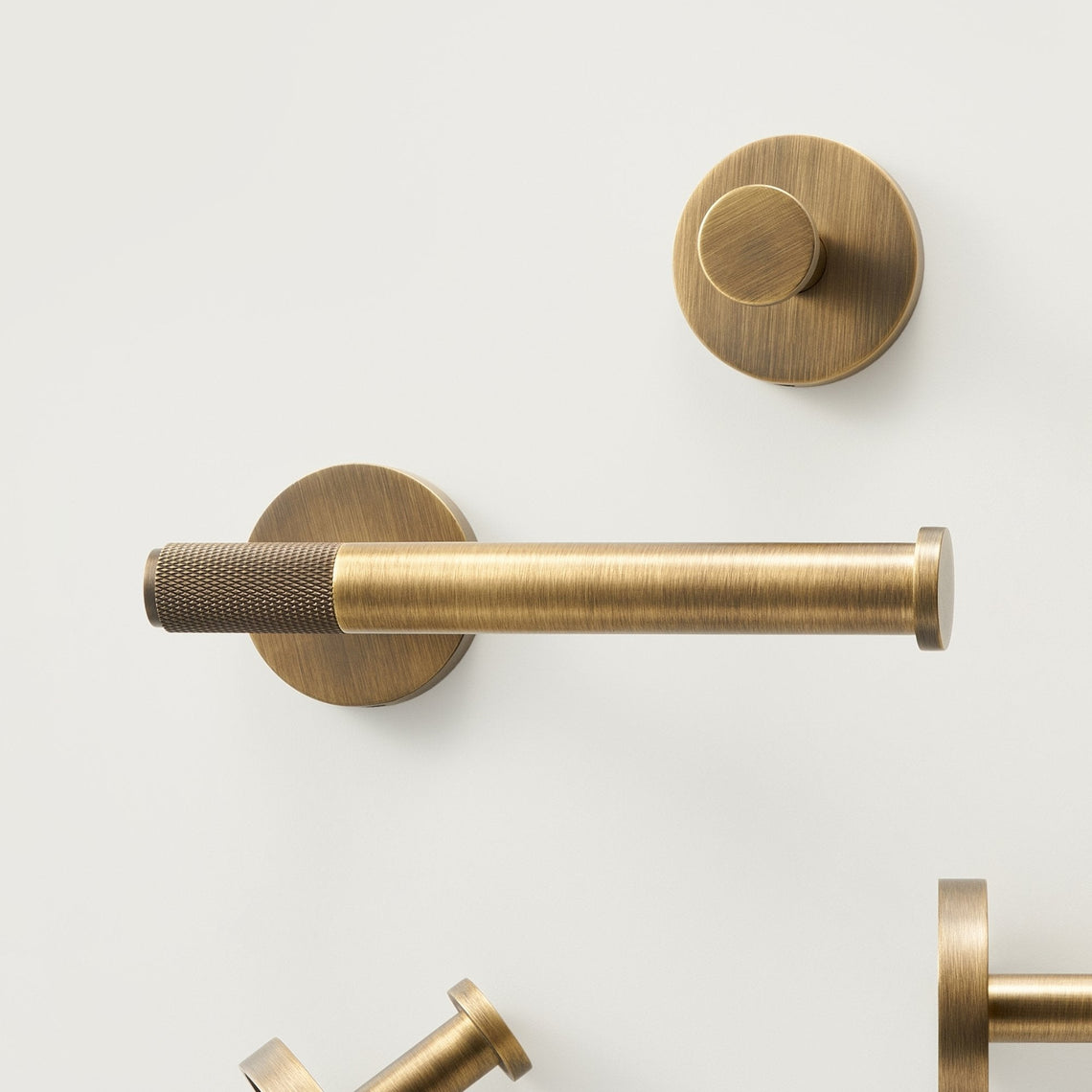 Elegancki uchwyt na papier toaletowy w wykończeniu z mosiądzu antycznego, łączący klasyczny design z solidną jakością. Ciepła, lekko patynowana powierzchnia nadaje łazience ekskluzywny charakter, a konstrukcja z litego mosiądzu zapewnia stabilne i wygodne użytkowanie każdego dnia.